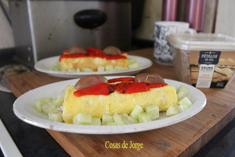 Decoramos la tortilla con tiritas del pimiento del piquillo y las aceitunas.