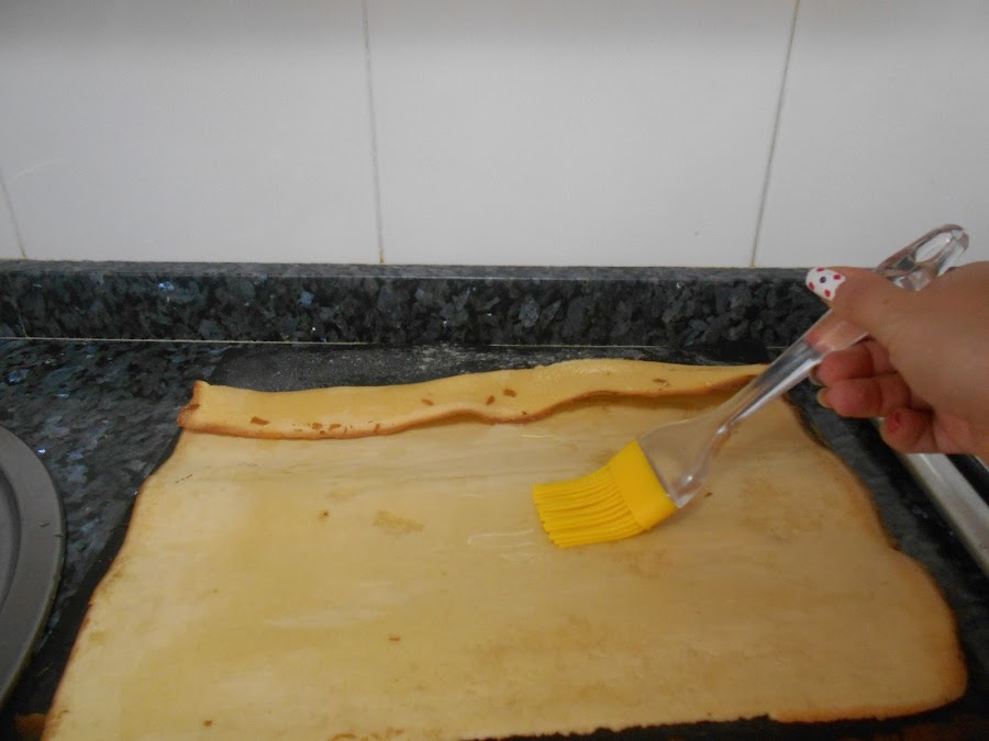 Extendemos el bizcocho plancha y pintamos con el almibar