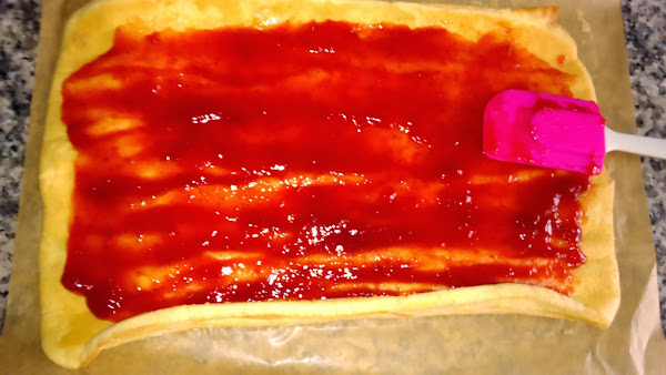 se extiende el bizcocho , se pone una capa generosa de mermelada de fresa