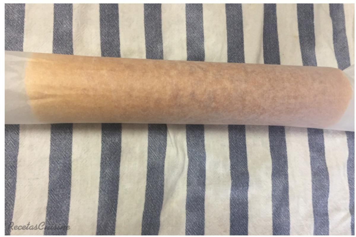 8. Una vez despegado, vamos envolviendo con el papel donde está apoyado, haciendo la forma del brazo de gitano. Una vez enrollado, cubrimos con el trapo y dejamos que se enfríe.