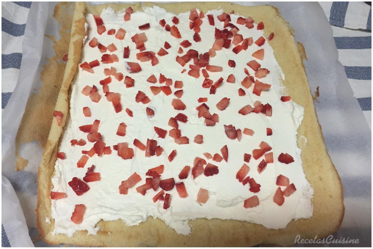 1. Una vez frío, vamos desenrollando la plancha de bizcocho con cuidado. Extendemos la nata (crema de leche) que tenemos reservada en la nevera (nos sobrará). Dejamos unos 2cm de margen con el borde sin rellenar, para que al enrollarlo no se salga.