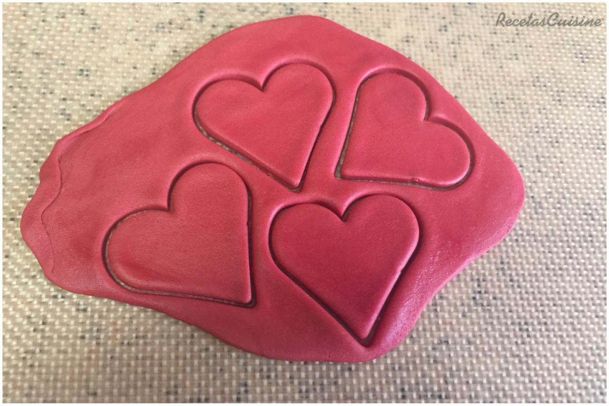 6. Hacemos los corazones estirando el fondant rojo con un rodillo y cortando la forma con el corta pastas. Si el fondant se nos pegara al rodillo, podemos añadir un poquito de azúcar glass. Los dejamos preparados para ponerlos nada más extender la cobertura, antes de que ésta solidifique.