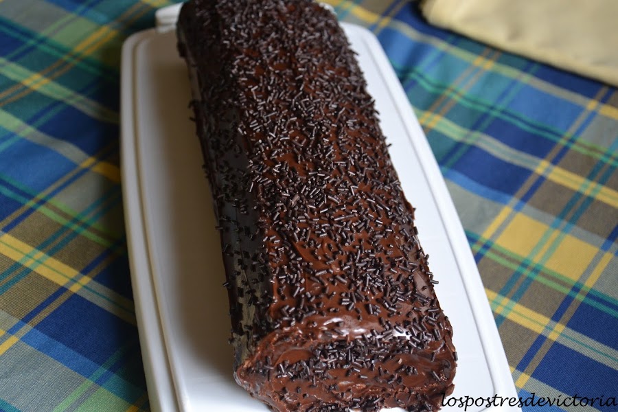 La extendemos por encima del bizcocho, enrollamos con cuidado y lo dejamos envuelto en el papel de horno.