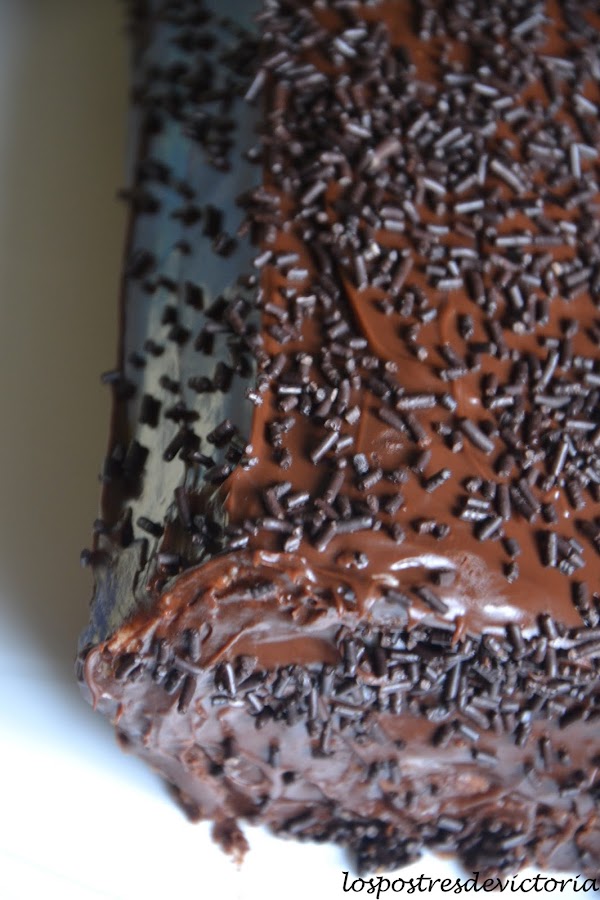 Ahora solo nos queda cubrirlo de un rico ganache que preparemos derritiendo al baño María el chocolate, la nata (crema de leche) y la mantequilla.