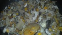 Pocha la cebolla picada fina con el ajo, la pimienta y el laurel, el oregano...en una sarten con el aceite. Añade la sal y tapa, manten a fuego medio y remueve de vez en cuando.