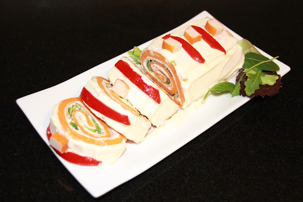 Antes de servirlo lo untamos con una capa de mayonesa por encima y lo adornamos con surimi y pimiento, lo cortamos en varias rodajas y ya está listo para comer, un aperitivo muy original para estas Navidades.