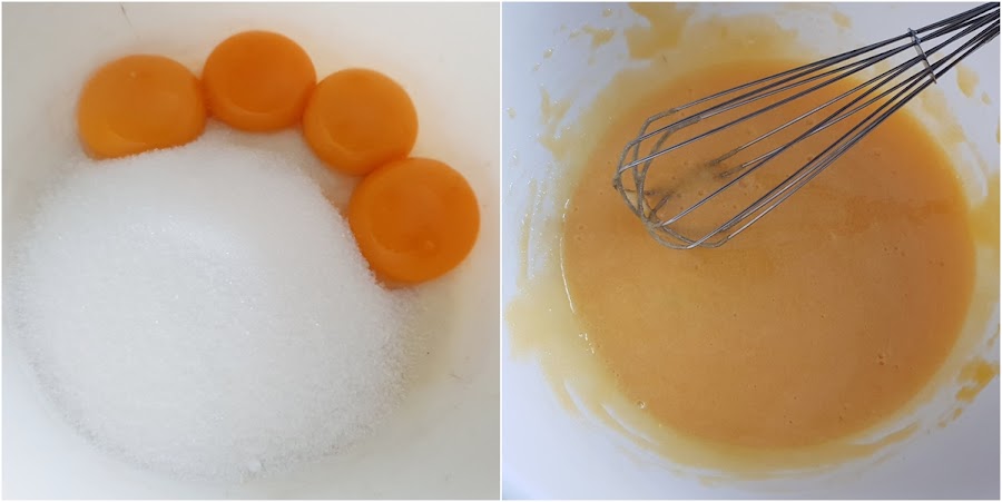 1. - Precalentamos el horno a 180º . Separamos las claras de la yemas, batimos las yemas con el azúcar y reservamos.