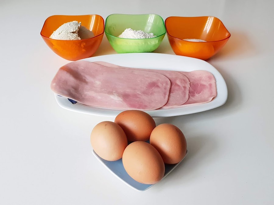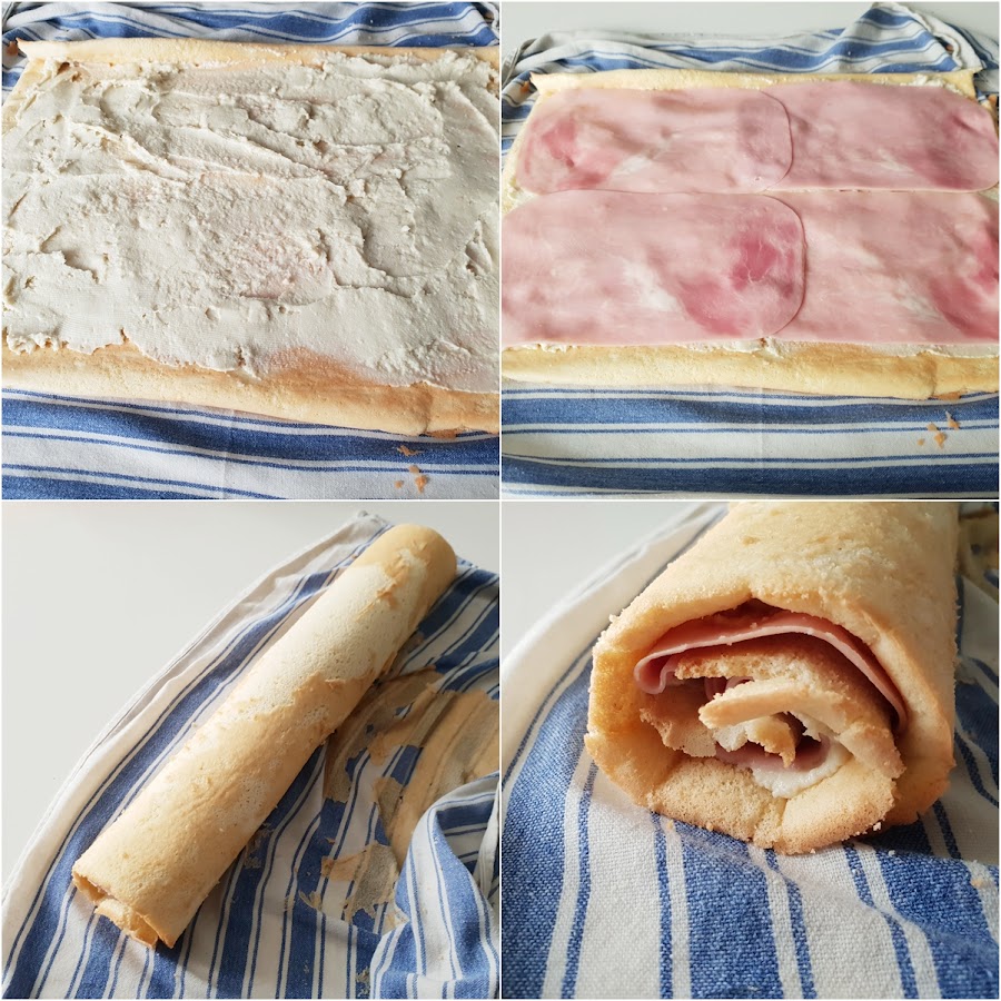 8. - Una vez esté frío, lo abrimos y lo untaremos con el queso y le colocamos las lonchas de jamón, sin llegar al borde.