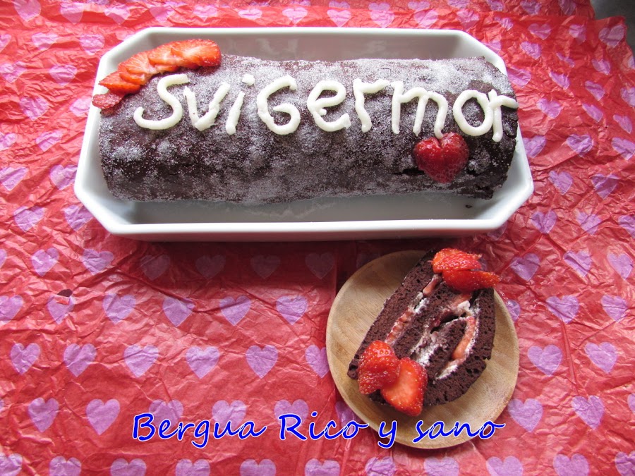 El bizcocho lo hice de chocolate y el relleno de fresa natural con un poquito de nata (crema de leche) endulzada con mermelada para mantenerlo húmedo y cremoso. Según mi suegra, quedó "celestial". La receta original es danesa y la encontráis aquí.