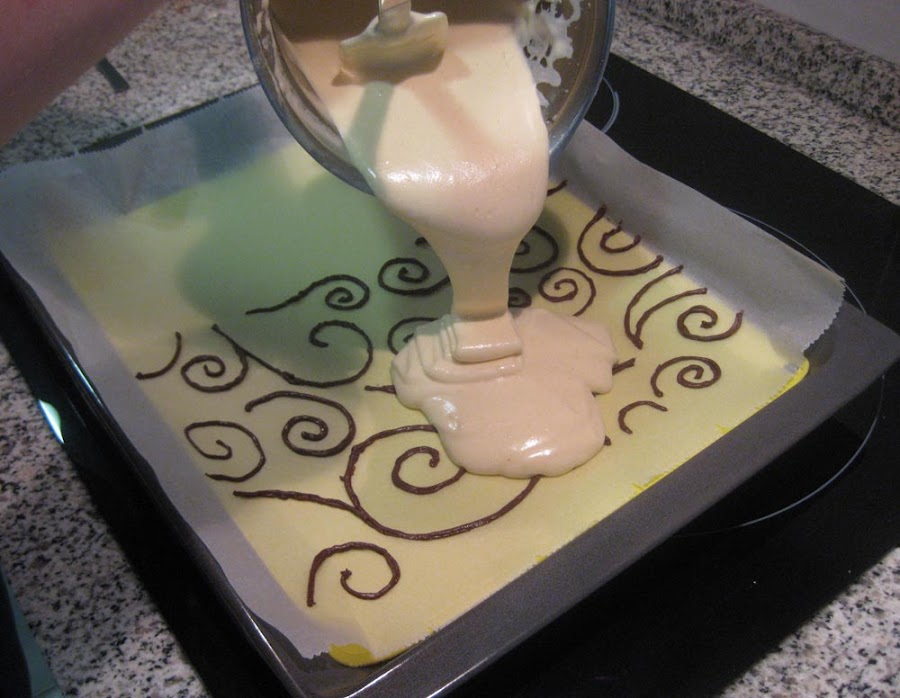 Sacamos nuestro dibujo del frigo, ponemos una lámina de hornear de silicona bajo el papel que habíamos decorado y vaciamos la mezcla sobre el mismo.