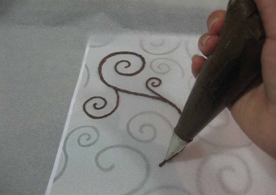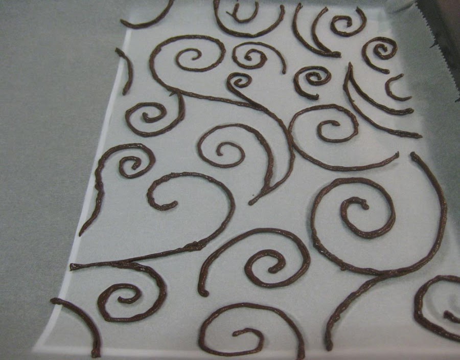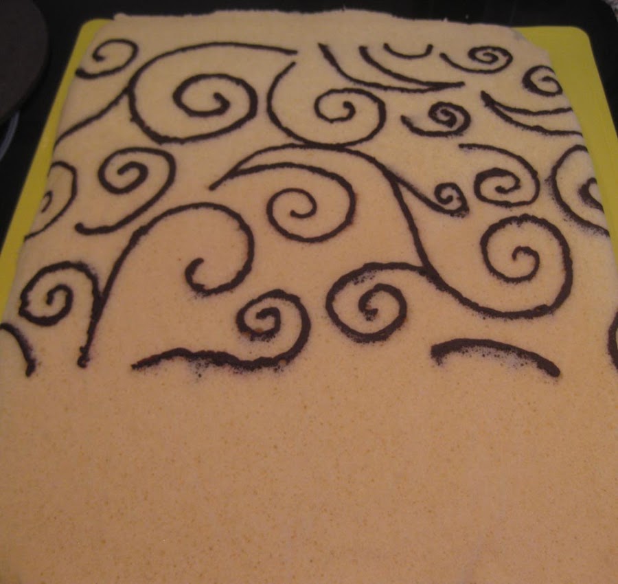 Procedemos a la decoración. Para ello colocamos sobre la bandeja del horno el dibujo elegido, sobre este, papel de horno y delineamos. Yo puse el dibujo en uno de los lados ya que lo que va enrollado por dentro no necesita que le hagamos nada. Lo metemos en el frigo y seguimos con la receta.