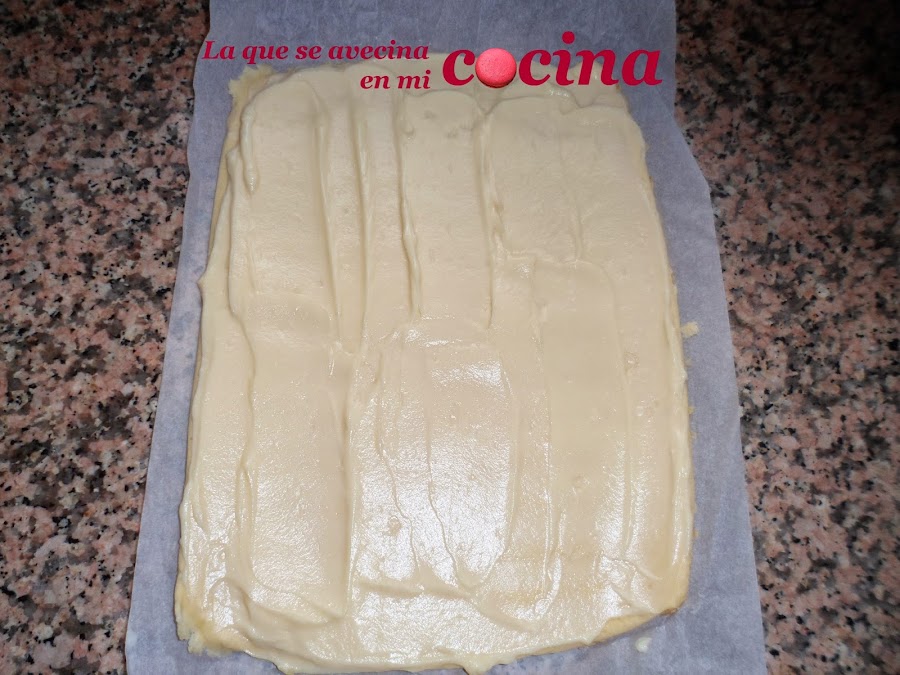 Una vez tengamos lista la crema, nos pondremos a realizar la placa de bizcocho que necesitamos. Mirad este enlace Bizcocho genovés para saber paso a paso cómo hacerlo.