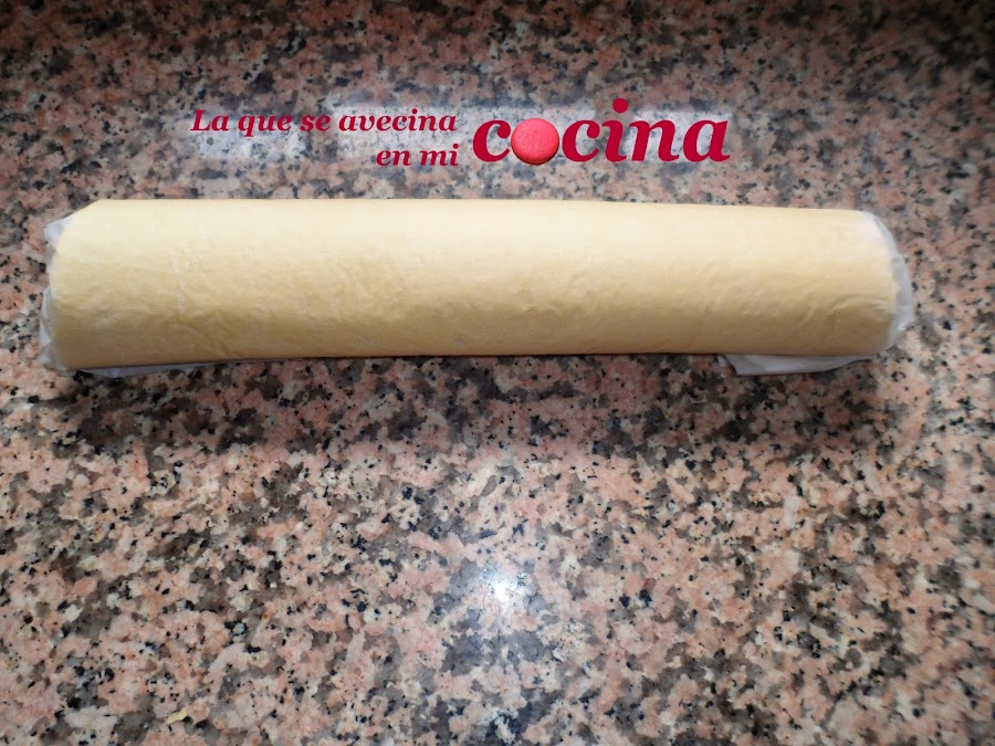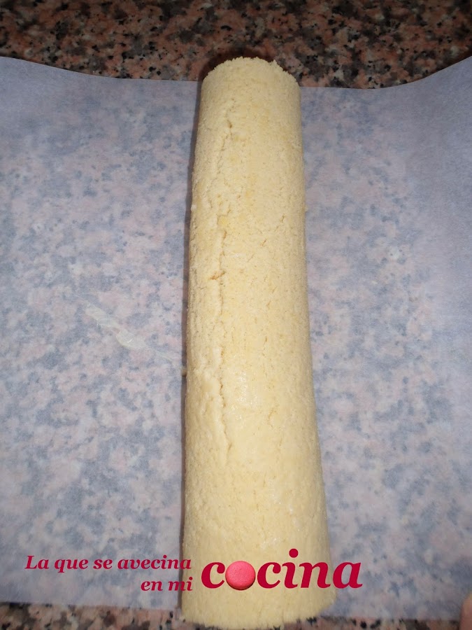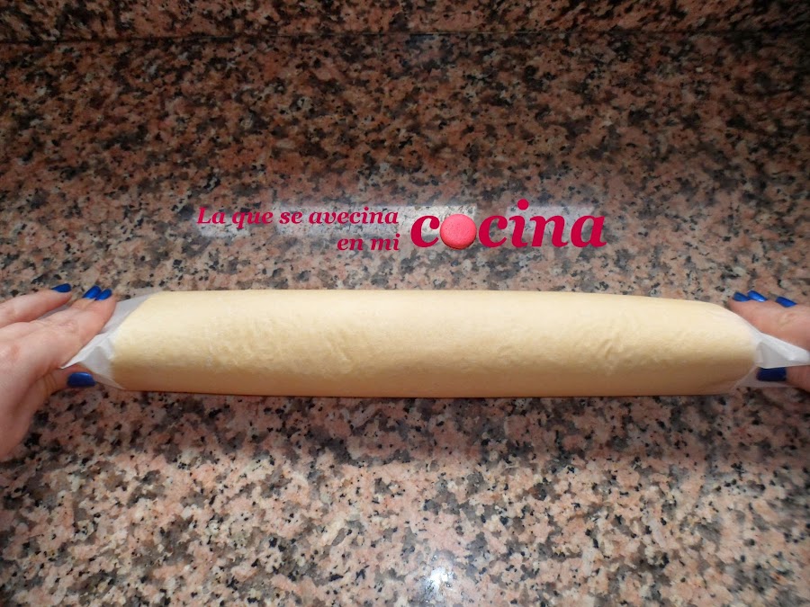 A continuación y una vez tengamos nuestra placa de bizcocho desmoldado, lo enrollaremos sobre sí mismo (y con el papel sulfurizado) con mucho cuidado pero eso sí, con firmeza. Cuando lo tengamos enrollado lo dejaremos así reposando unos 30 minutos.