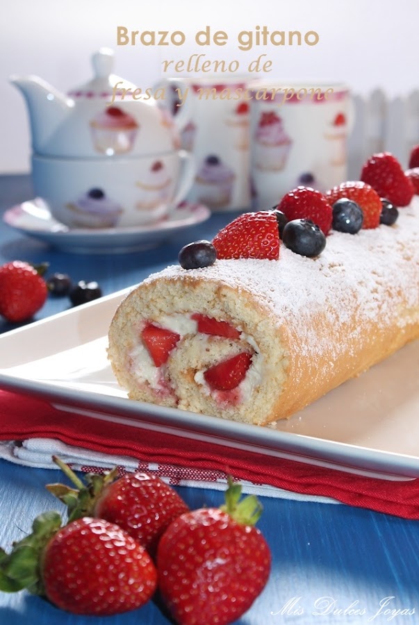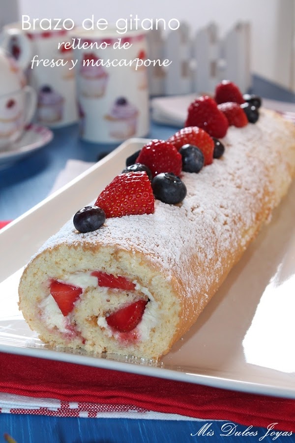 Último día del mes de Mayo, toca Reto Cocinillas. Este mes la propuesta escogida es dulce, y me ha encantado este brazo de gitano, yo suelo rellenarlo con nata y fresas, pero la textura y el sabor de la crema de mascarpone me ha gustado, y las fresas maceradas hacen que quede muy jugoso. INGREDIENTES: PARA EL BIZCOCHO: 3 Huevos 80 gr. de azúcar glass 80 gr. de harina de repostería 1 pizca de s ...