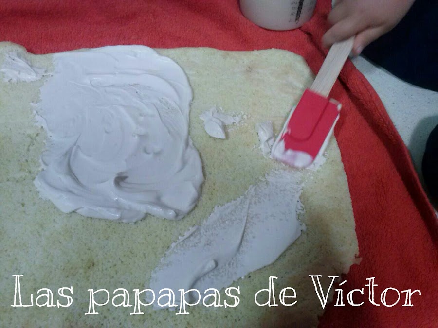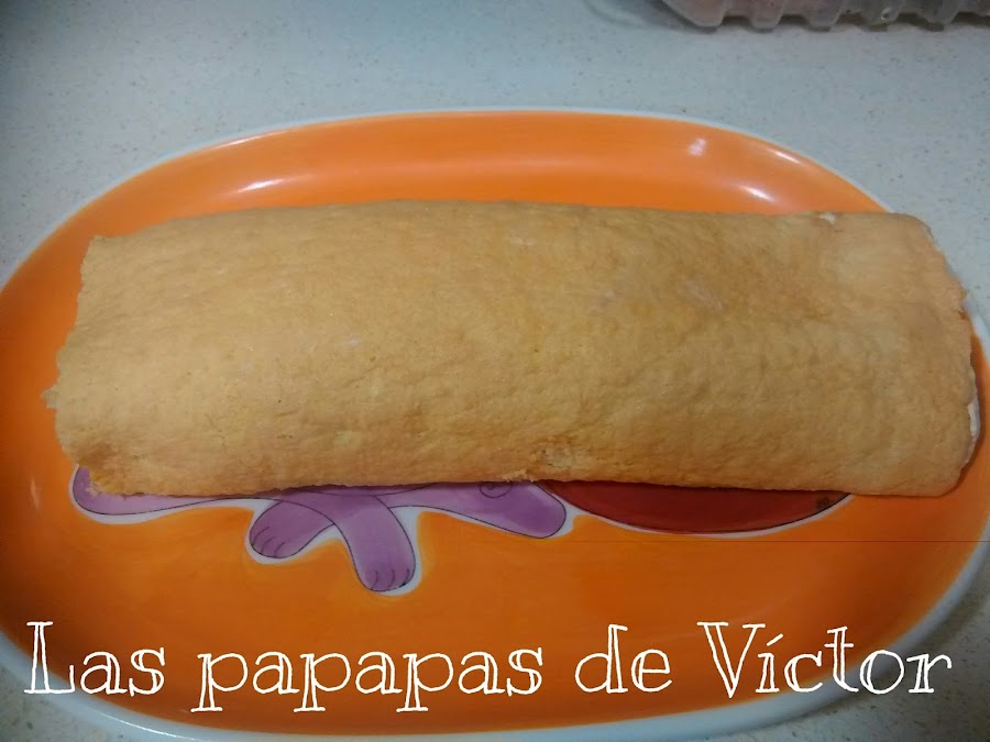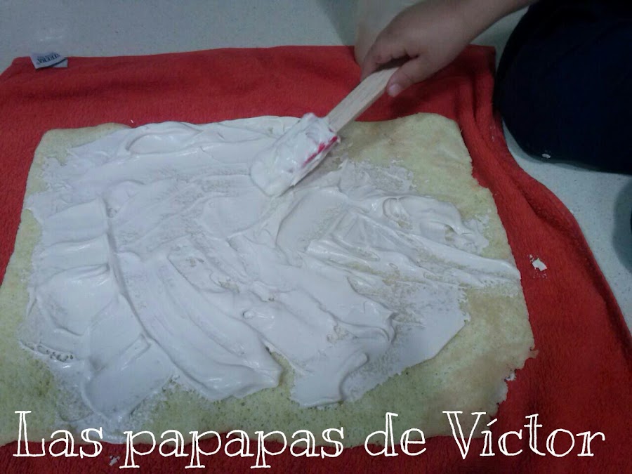 Una vez tibio extenderlo de nuevo y poner el relleno que más os agrade, como ya os dije mi peque quería nata (crema de leche); así que coji un bote de nata (crema de leche) de 35%M.G y con un sobrecito de monodosis de azúcar batir y en minuto esta listo.