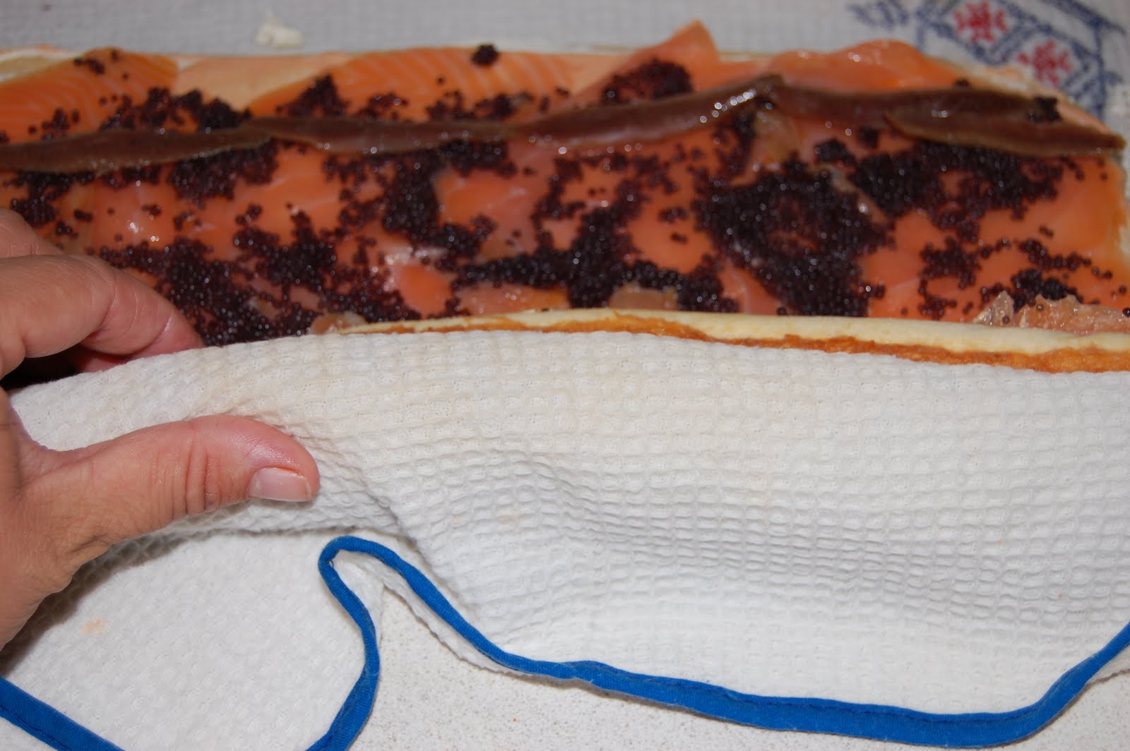 En dos lineas paralelas colocamos las anchoas y con ayuda de un paño húmedo enrollamos el bizcocho.
