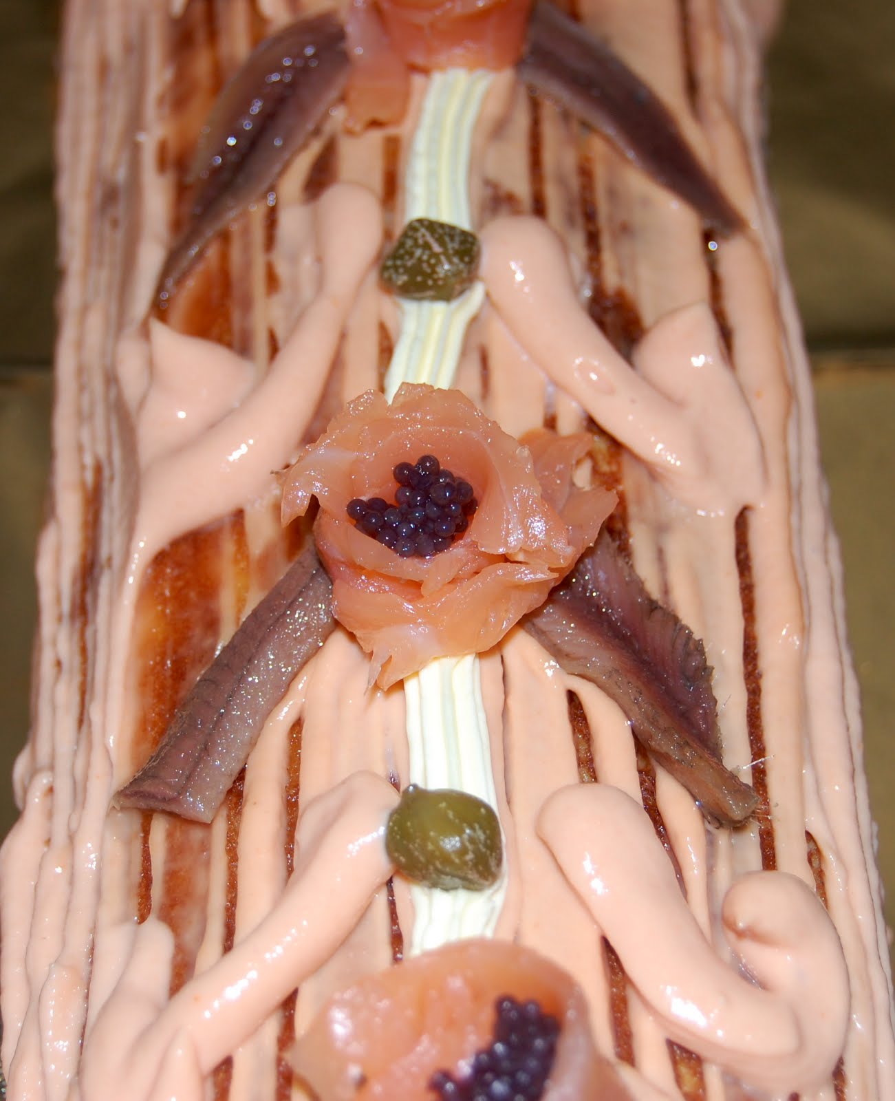 Hacemos unas rositas con el salmón, cortando tiras finas y enrollandolas en la punta del dedo ., seguimos decorando a nuestro gusto con el resto de anchoas y las alcaparras o pepinillos..