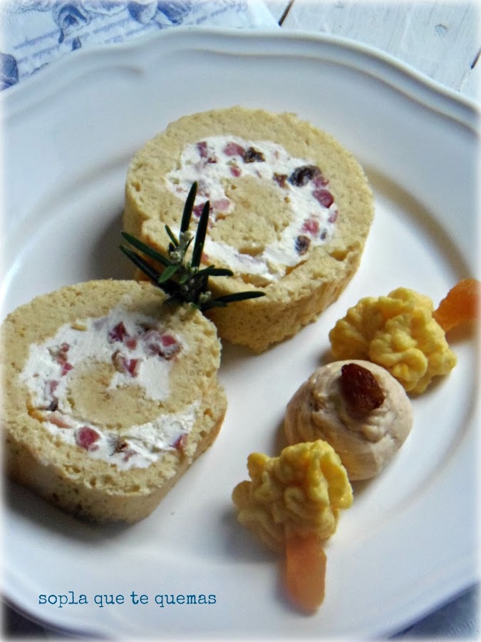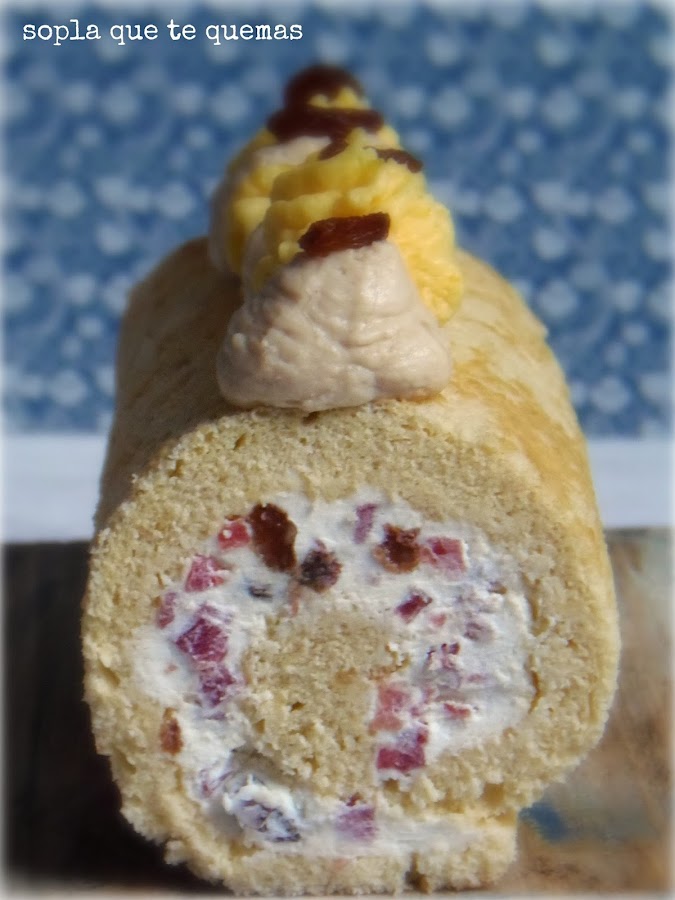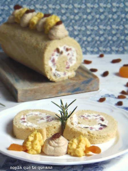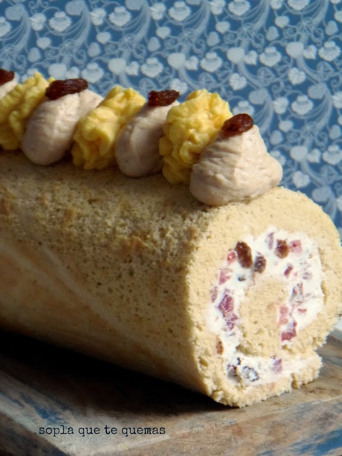 5. Montaje, cortamos los dos bordes del brazo de gitano que quedan mas feos. Vamos colocando encima las dos mousses, unas pasas para decorar y listo.
