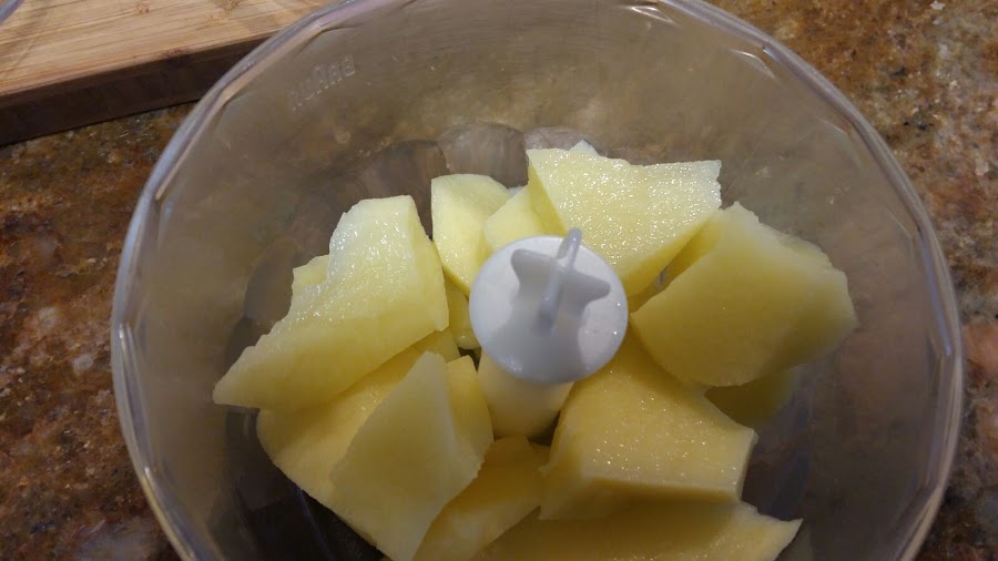 Empezamos pelando y picando las patatas en la picadora y también la cebolla.