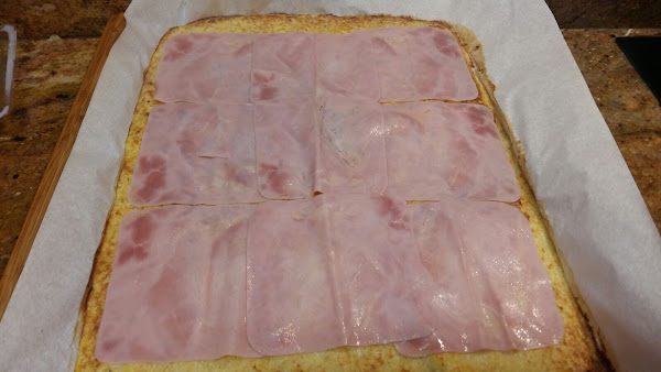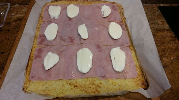 Primero ponemos el jamón york. En principio serán 4 lonchas grandes o 9 de las cuadradas tamaño sandwich y cortamos la bola de mozzarella en 9 tiras y colocamos.