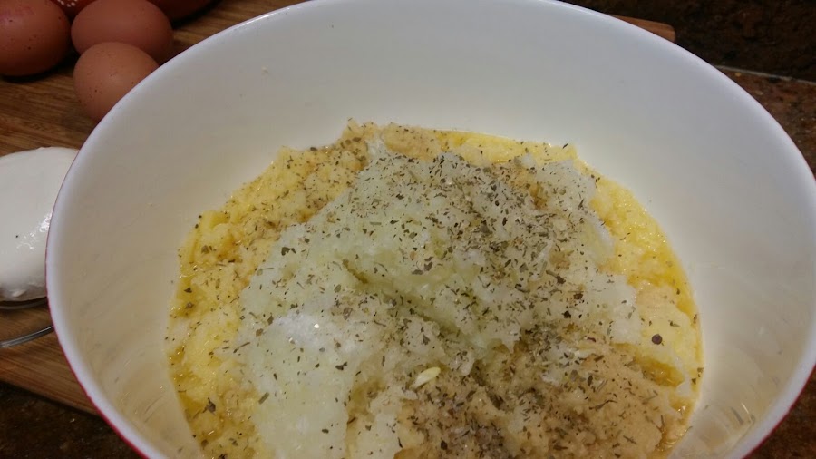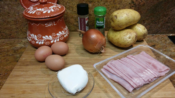 3 patatas grandes, 1 cebolla, 3 huevos, 1 bola de mozzrella de búfala, 9 lonchas de jamón york , hierbas provenzales, pimienta molida y sal.