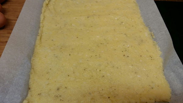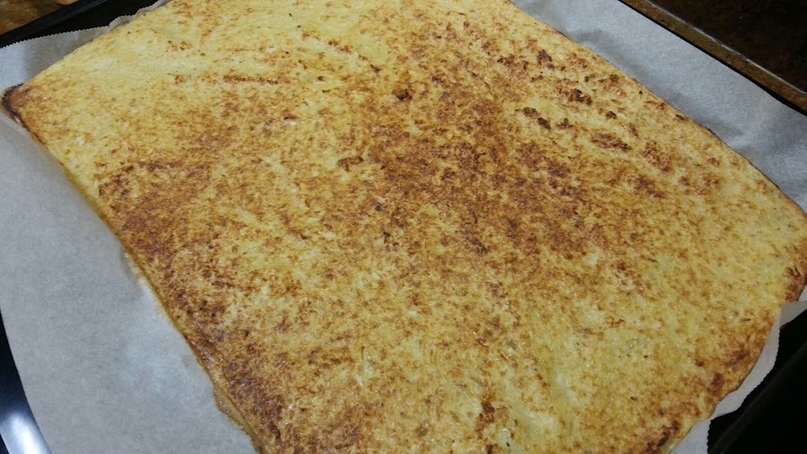Colocamos en una bandeja de horno un papel de horno y extendemos ayudándonos con una lengua de gato toda la mezcla para que quede igual de alto por todas partes.