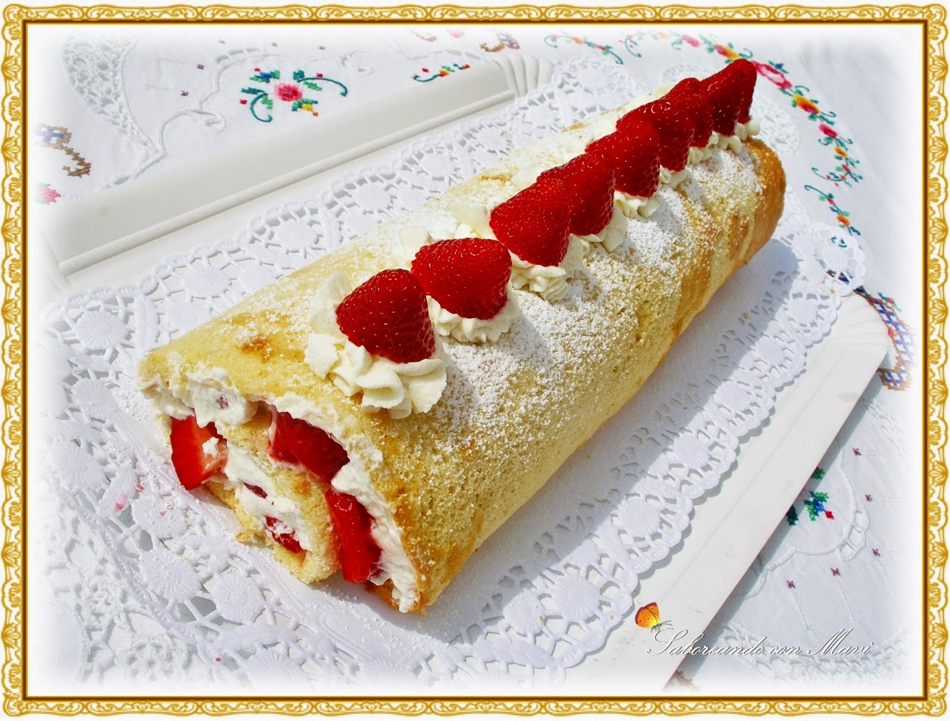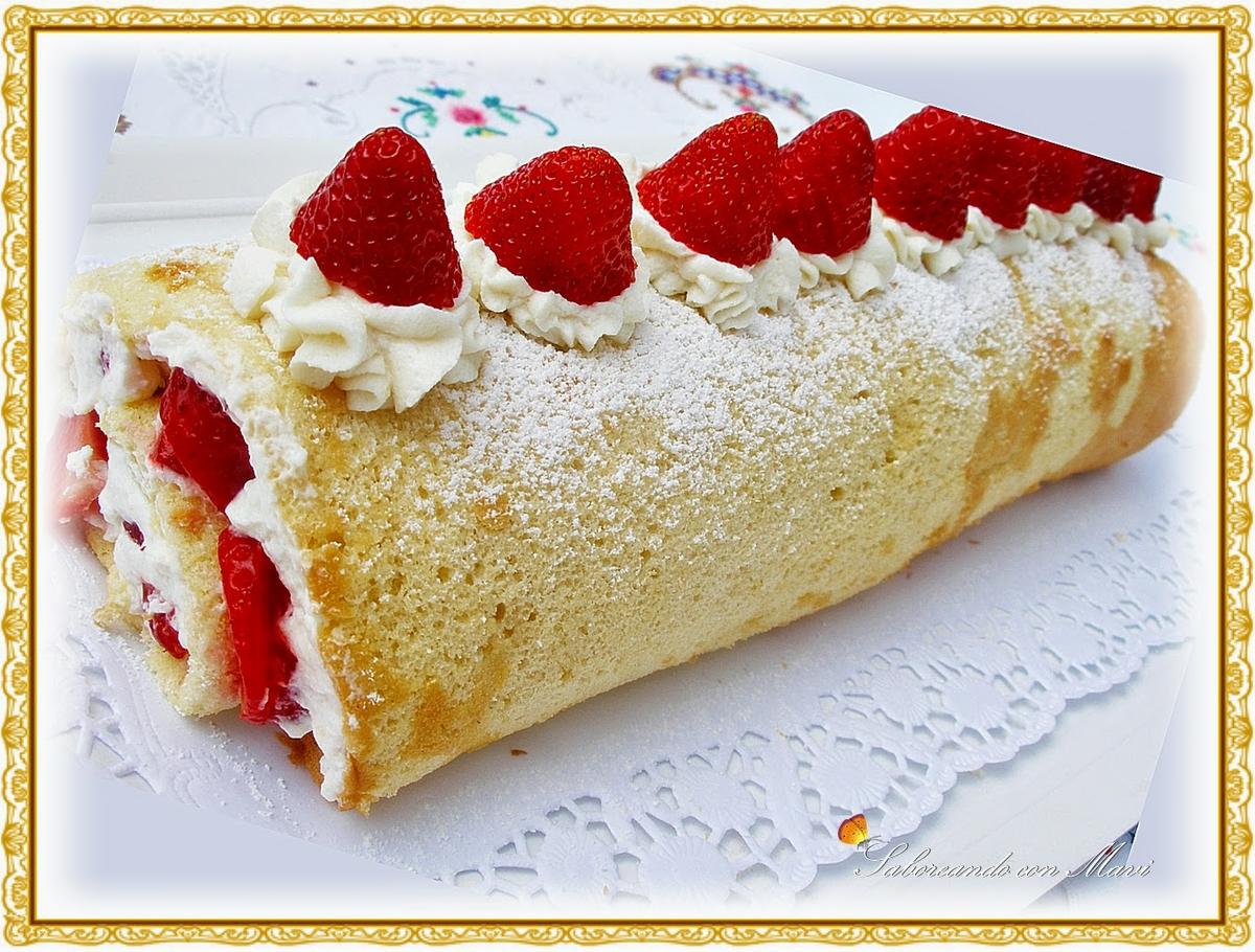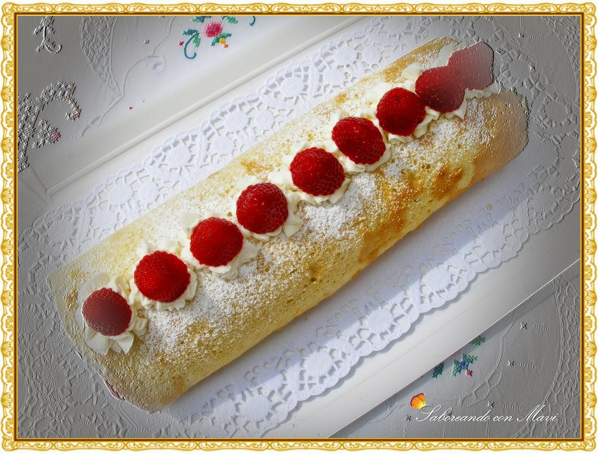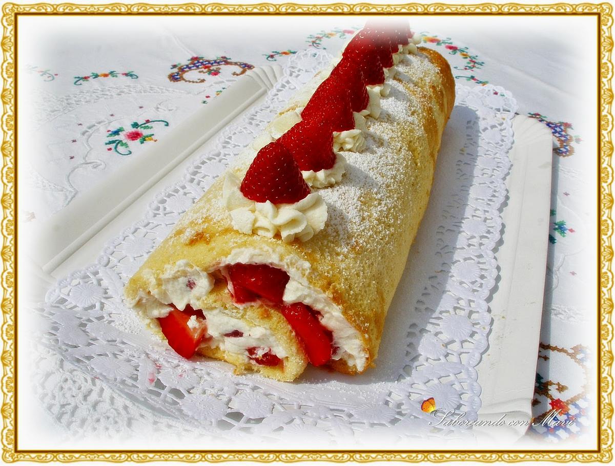 Rellenamos con nata (crema de leche) y repartimos las fresas dejando el último extremo libre.