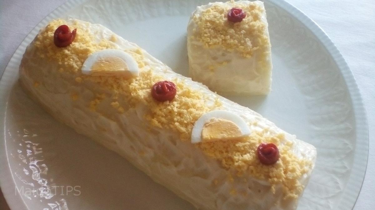 Colocar el brazo en una fuente, recortando los laterales y nos queden rectos. Cubrirlo con una capa de mayonesa, rallar la yema reservada y esparcirla por encima, por último cortar el pimiento también reservado en 3 o 4 tiras finas, enrrollarlas sobre si mismas y colocándolas sobre la yema al lado de una rodaja de huevo duro partidos. Guardar en el frigorífico y servir bien frío. ¡A disfrutarlo!