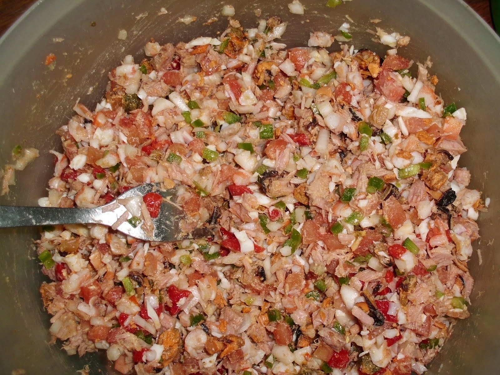 Lo ponemos en la fuente donde lo vamos a servir y lo cubrimos con mayonesa y lo adornamos a nuestro gusto, yo reservé un huevo duro y unas anchoas , así como unas tiras de pimiento para adornarlo, tambien le puse unas gambas cocidas peladas y hojas de lechuga de roble.