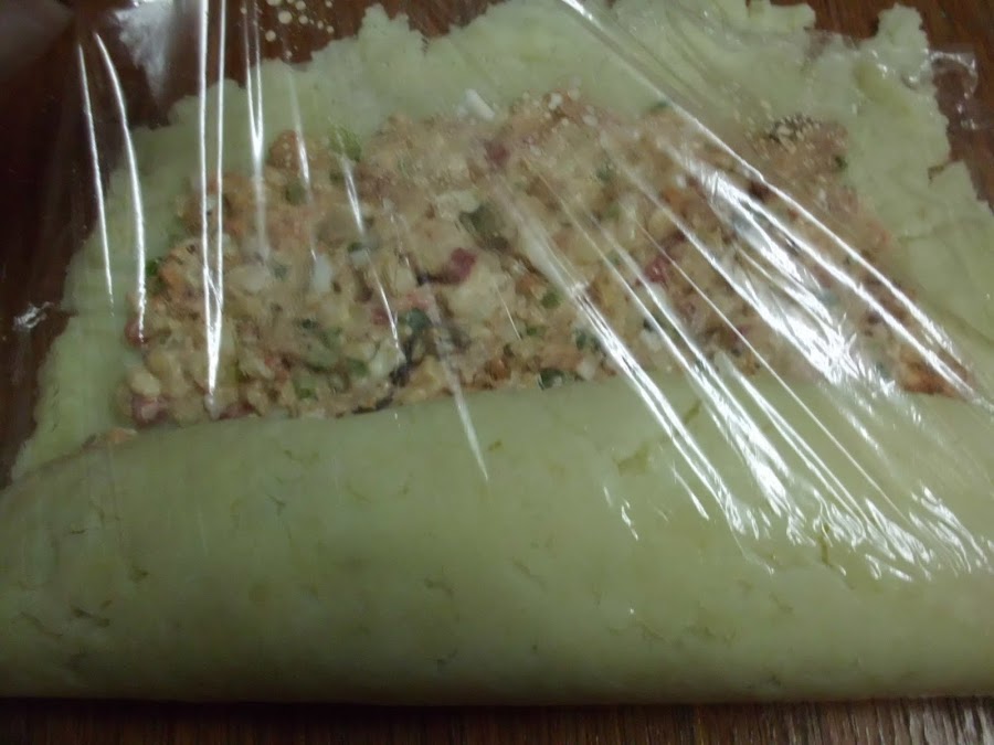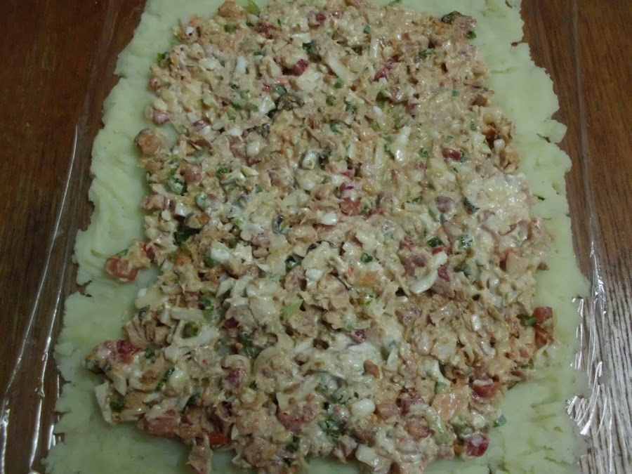 en un bol ponemos los ingredientes, cortador a trocitos pequeños, lo mezclamos bien y lo ponemos sobre el pure repartiendolo bien.Ayudandonos con el film lo vamos arrollando como un cilindro.