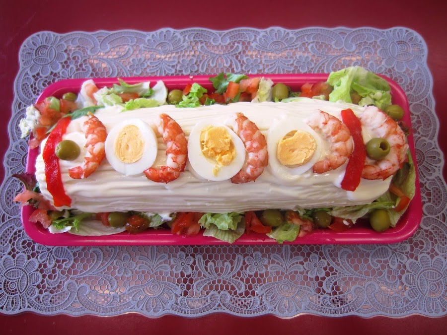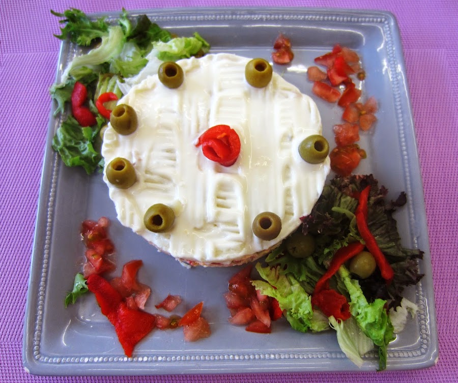 Por encima lo cubrimos con una fina capa de mayonesa y alrededor ponemos una ensalada de lechugas variadas aliñada.