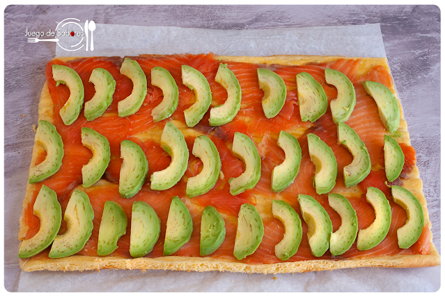 Untar la plancha ligeramente con un poquito de mayonesa. Cubrir de salmón y de aguacate como puede verse en la foto.