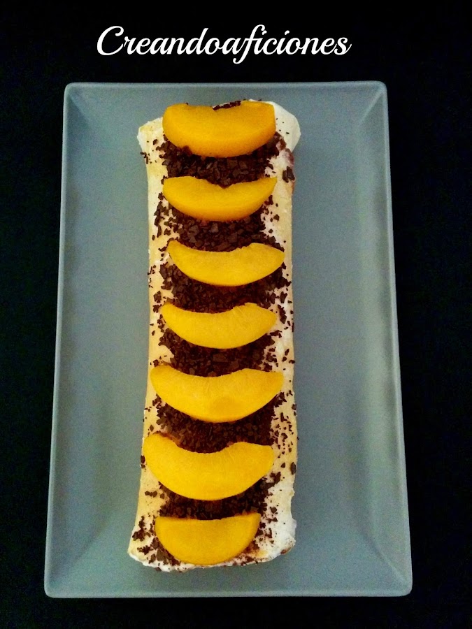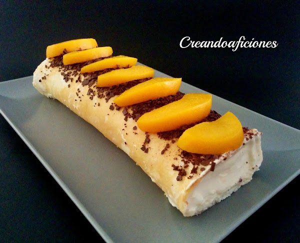 Enrollamos la plancha de bizcocho, echamos chocolate para decorar, cortamos melocotón y lo ponemos por encima. Lo metemos en la nevera y es mejor dejarlo de un día para otro.Que disfrutéis!!!!!!!!!!!!!!!!!!!!!!!!!!!!!