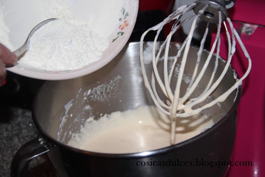 Incorporamos la harina y la levadura y seguimos batiendo a velocidad alta.