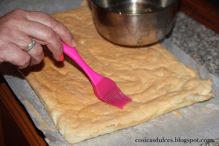 Cuando el bizcocho esté listo lo pincelamos (sin excedernos) con un almíbar ligero.