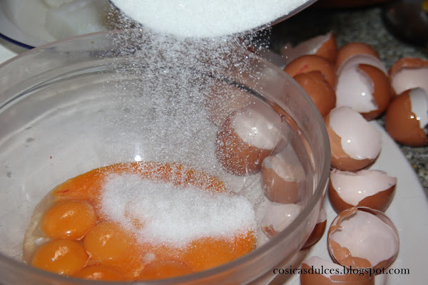 Una vez que la trufa está fría preparamos la lámina de bizcocho. Comenzamos batiendo las yemas con el azúcar hasta que blanqueen.