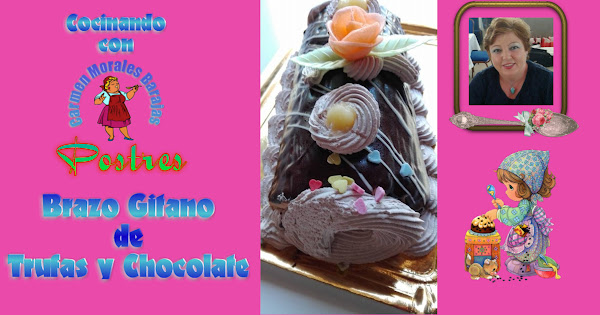 Untamos el bizcocho con el almíbar. Ponemos la trufa y la extendemos bien por todo el bizcocho (conviene que nos sobre una poca) y comenzamos a hacer el brazo enrollando el bizcocho.