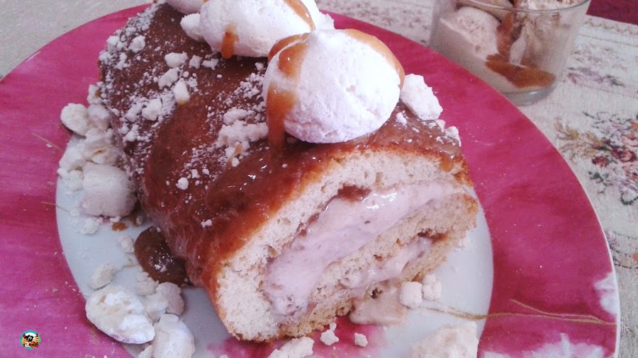 2.- Dejamos el helado 15 minutos a temperatura ambiente. Extendemos una capa de bienbesame dentro del bizcocho, lo untamos con helado y esparcimos unos suspiros desmigajados dentro. Cerramos el rollo y lo guardamos hasta el momento de servir en el congelador. Secamos 30 minutos antes y lo untamos con el bienmesabe por fuera, decoramos con unos suspiros, y esparcimos suspiros desmigajados sobre el brazo gitano. Servimos enseguida.