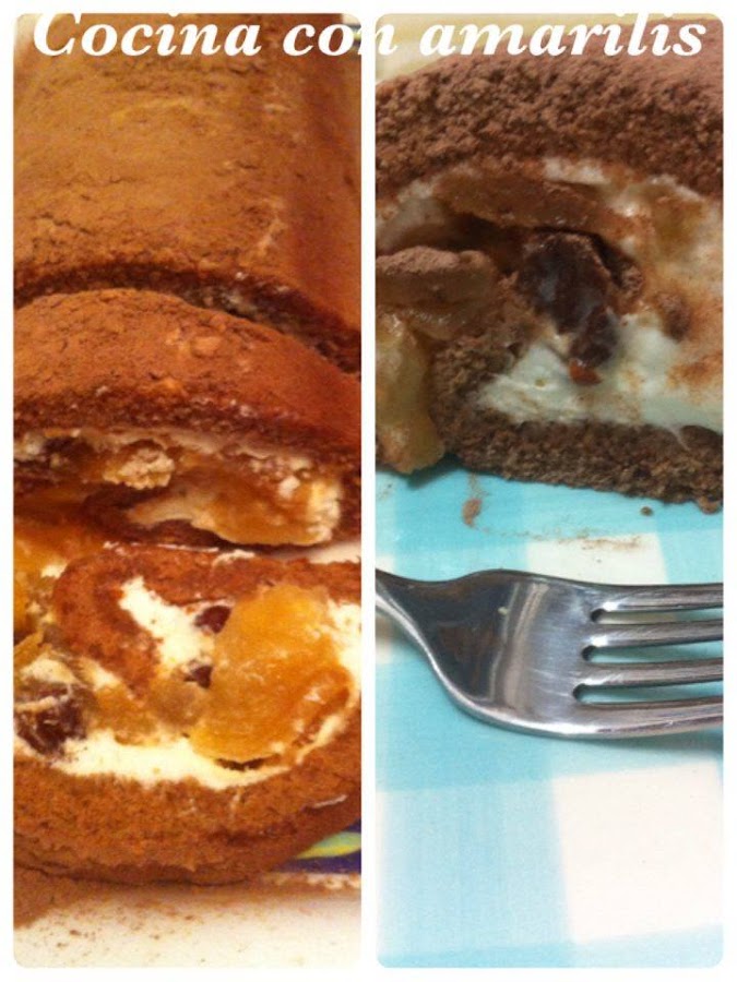 Para el bizcocho .- 5 huevos, 150 g de azúcar, 1 sobre de azúcar avainillada, pizca de sal, 150 g de harina 5 cucharadas de agua o leche tibia 3 cucharadas de cacao en polvo.