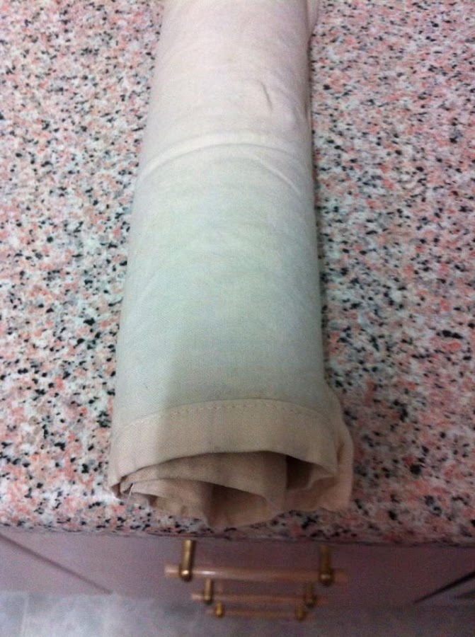 Tienda un paño de cocina en la encimera y vuelque el bizcocho sobre el paño, retire el papel y enrolle inmediatamente el bizcocho con la ayuda del paño y deje enfriar.
