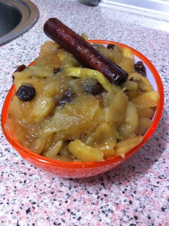 Para el relleno.- 2 manzanas, 3 cucharadas de azúcar (mejor moreno) 1 rama de canela (o 1 cucharada de canela molida ) , 1 cucharada de mantequilla, 1/2 vasito de agua.