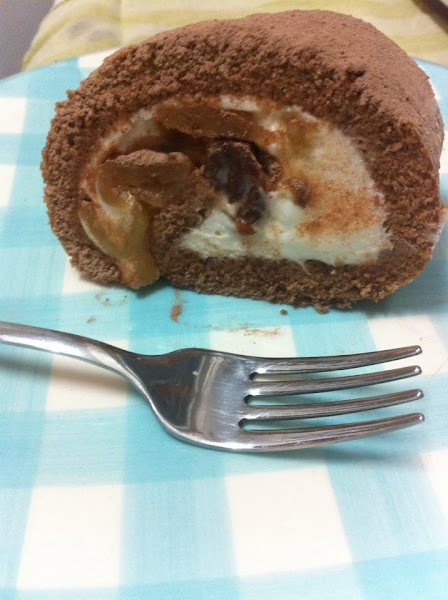 *Desenrolle el bizcocho con cuidado, rocielo con el licor de manzana y cubralo de la nata (crema de leche) , ponga encima la manzana caramelizada y enrolle de nuevo el bizcocho con el paño y déjelo enfriar en la nevera 1 o 2 horas.