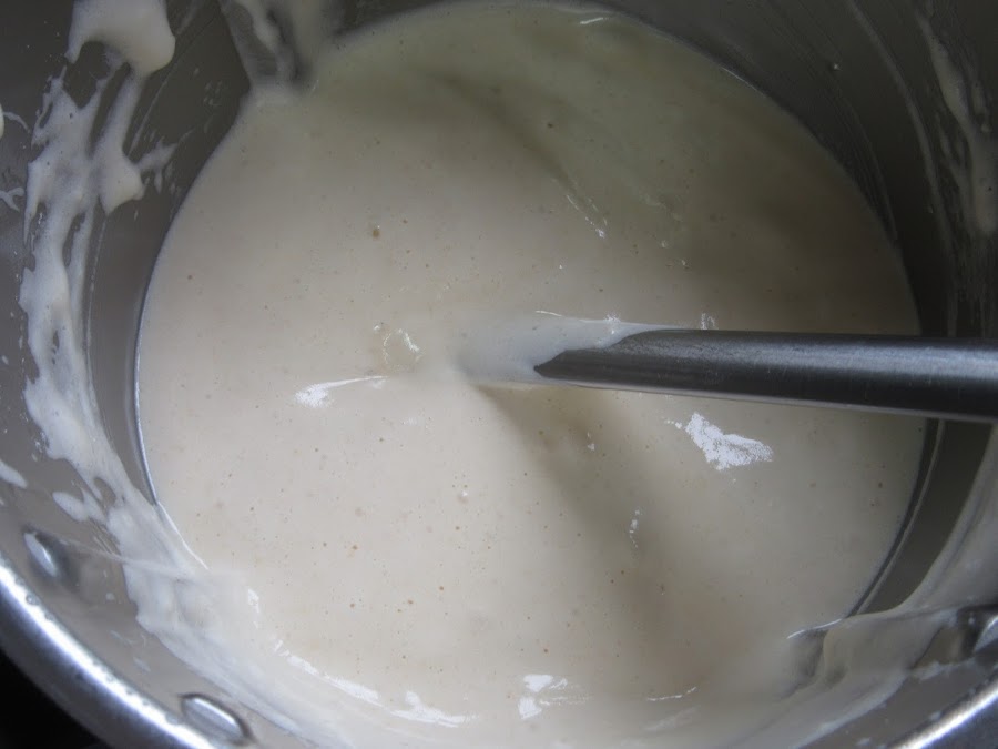 1- Todos los ingredientes en un cazo, leche, azúcar, maizena, mantequilla, huevos y vainilla Triturar con un turmix, que quede la mezcla sin grumos.