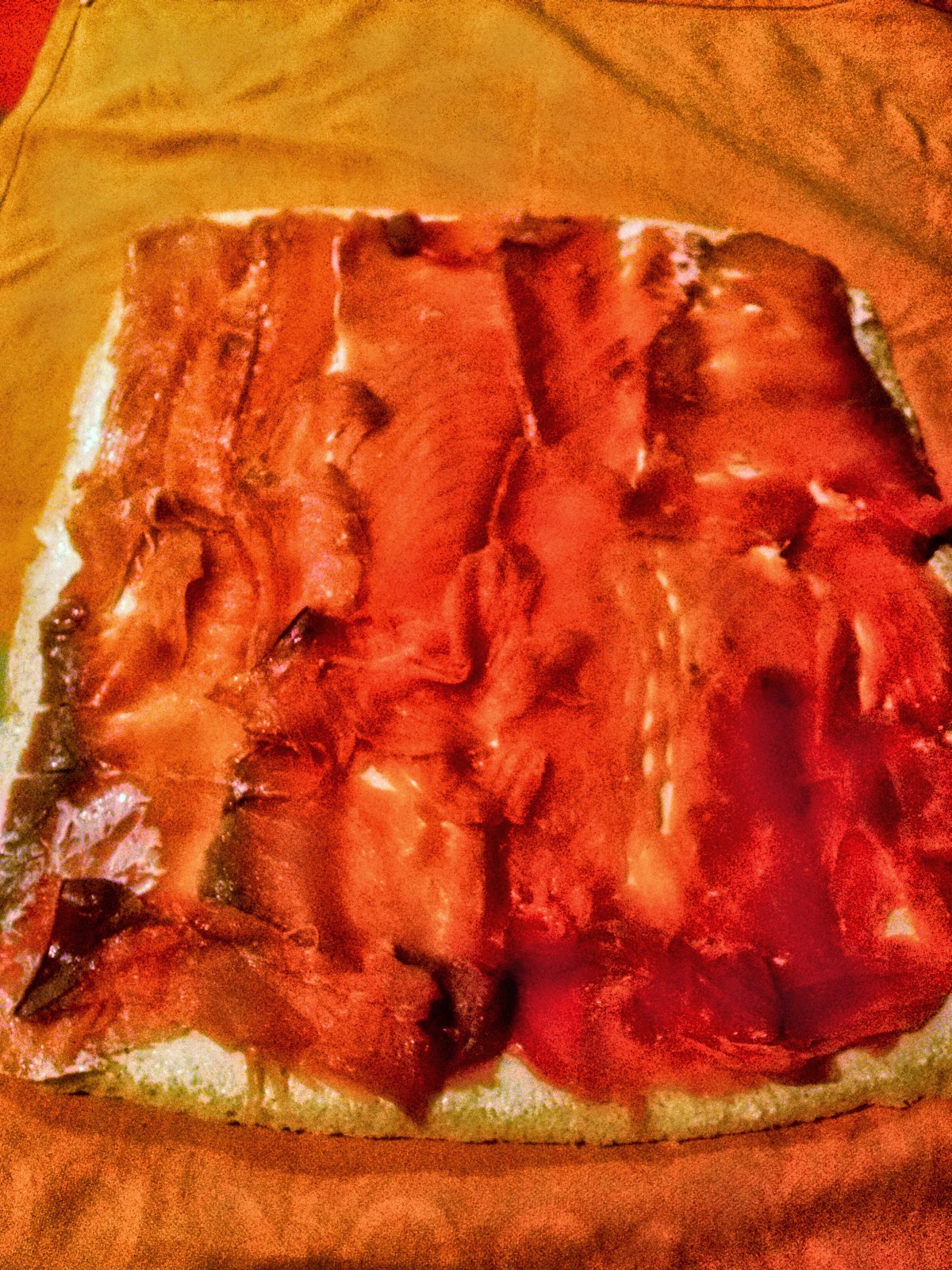 Desenrolla la plancha y unta con el queso, encima coloca el salmón ahumado y vuelve a enrollar.