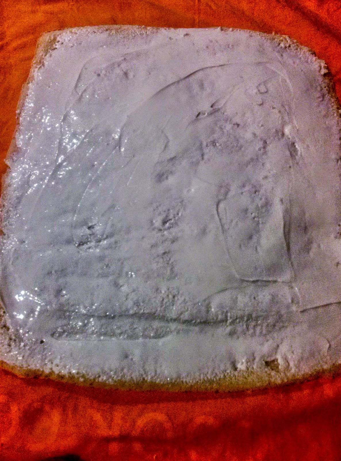 Colocar un papel vegetal en la bandeja del horno, y añade la masa y aplana con alguna espátula. Meterla en el horno y cocer 10 o 12 minutos a 180º.Una vez horneada, templamos un poco fuera del horno y le quitamos el papel. Sobre un paño limpio, ponemos la plancha y la enrollamos junto al paño y la dejamos enfriar bien.