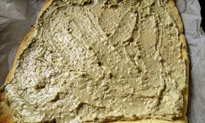 Mezcla la mantequilla con el queso y haz una pasta ( puedes hacerlo usando un tenedor y removiendo o en el vaso de la thermomix, echando en él la mantequilla y el roquefort, programando velocidad 3 durante unos segundos ). Unta la plancha del bizcocho con esta mezcla.