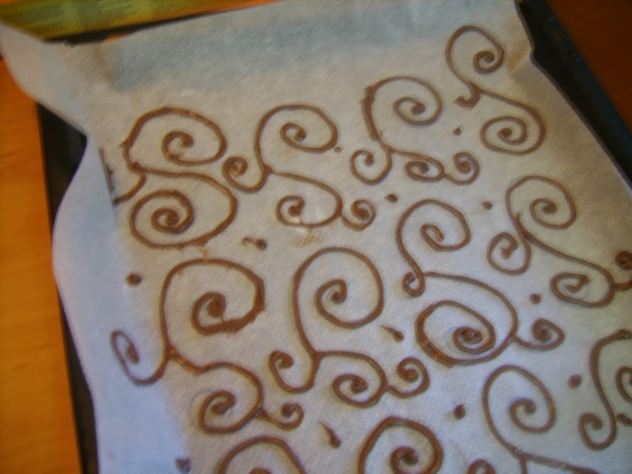 Primero hacemos la crema para el dibujo mezclando la mantequilla derretida con la clara batida, el azúcar, harina y cacao. Mezclar y poner en una manga pastelera con boquilla muy fina.