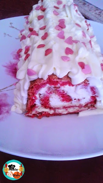 Así que me puse manos en la masa. he hice este brazo gitano lleno de corazones y buttercream de queso, para que resaltara el bizcocho, lo hice de color rojo y con aroma de fresa...También hice unos pastelitos de limón...otro momento publicaré la receta.