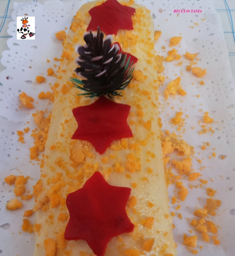 los espárragos picaditos, las aceitunas partidas en cuatro, el tomate picadito, hacemos los huevos duros y los picamos (reservamos yema de huevo para decorar), picamos los pimientos del piquillo ( y dejamos algunos para decorar), picamos el jamón cocido,añadimos un poquito de sal y removemos todo bien hasta que esté todo mezclado. Añadimos un par de cucharadas de mayonesa y removemos. Desenrollamos con cuidado la plancha de bizcocho y untamos un poco de mayonesa y vamos poniendo todos los ingredientes que habíamos mezclado encima de la plancha y con la ayuda de una lengua de gato (o tenedor) vamos alisando todos los ingredientes. Cuando esté todo repartido con cuidado empezamos a enrollar, pintamos todo el brazo gitano con mayonesa y para decorar yo puse yema de huevo picadita y estrellas de pimiento del piquillo (las hice con un cortador de galletas). Metemos en la nevera y nos los comemos fresquito. Está riquísimo!!! ;)