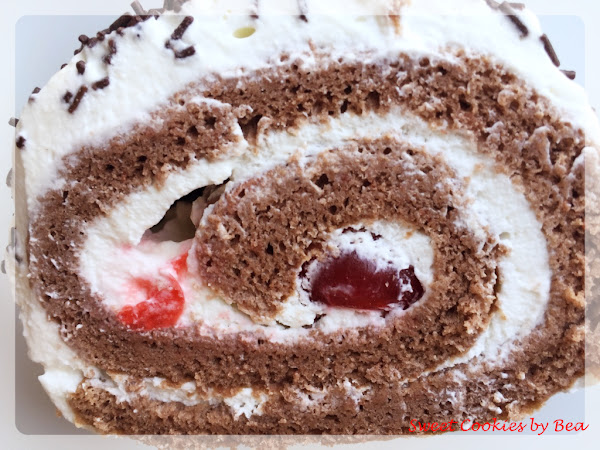 Volvemos a enrollar y decoramos por fuera con la nata (crema de leche), las virutas de chocolate y las cerezas que hemos reservado que cortaremos por la mitad.